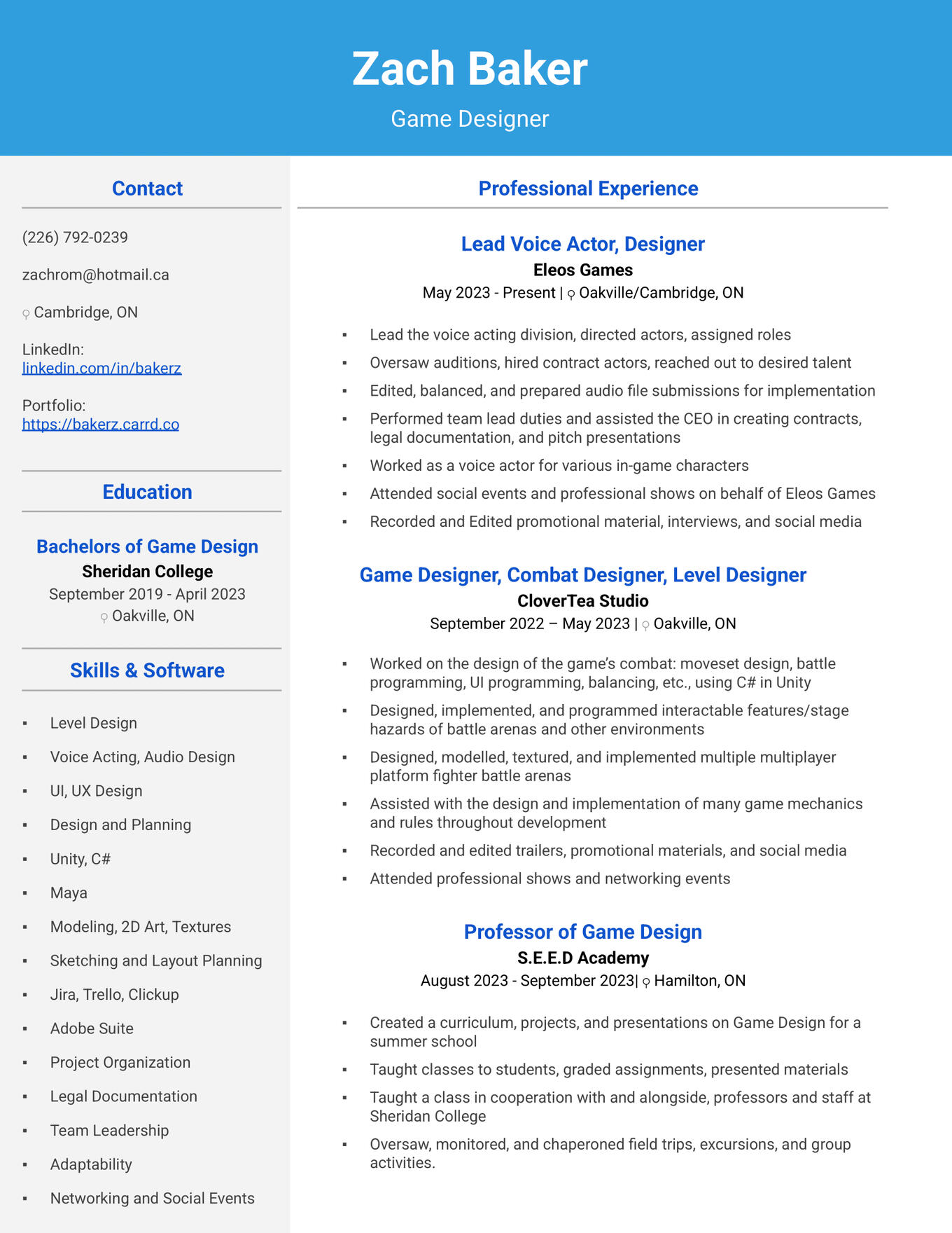 Hey, I'm Zach! A game, level, UI/UX designer, voice actor, and streamer from Ontario! I'm an honor graduate of Sheridan's Bachelor's of Game Design program as of April of 2023.After graduating I've spent my time working on various other personal projects both in and out of the industry. I'm currently working with Eleos Games as a voice actor, and assistant level designer & writer!